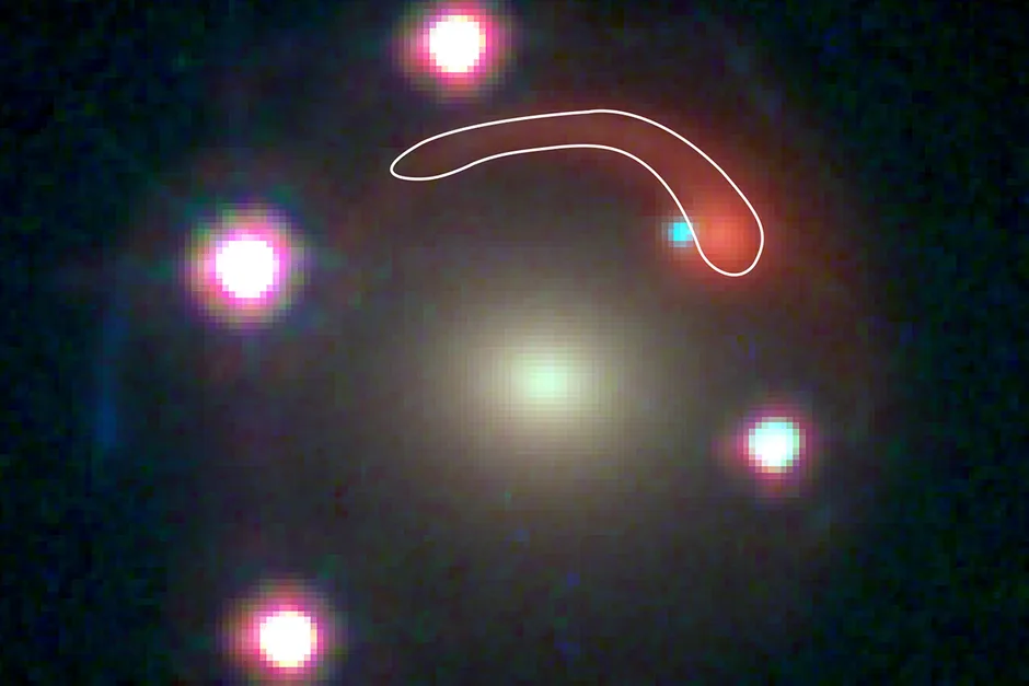 beeldjes dezelfde helderheidsvariatie te vertonen als die van de quasar, maar dan met verschillende vertragingen. Die ontstaan door de verschillende weglengtes die het licht van de quasar naar de aarde heeft afgelegd. Het zijn ook deze vertragingen die de astronomen straks hopen te kunnen gebruiken voor het afleiden van belangrijke kosmologische parameters, zoals de Hubbleconstante en de donkere energie die de uitdijing van het heelal lijkt te versnellen. (GB/Astronomy & Astrophysics, te publiceren) (Image credit: NASA/ESA/Hubble/JWST/Frederic Dux)