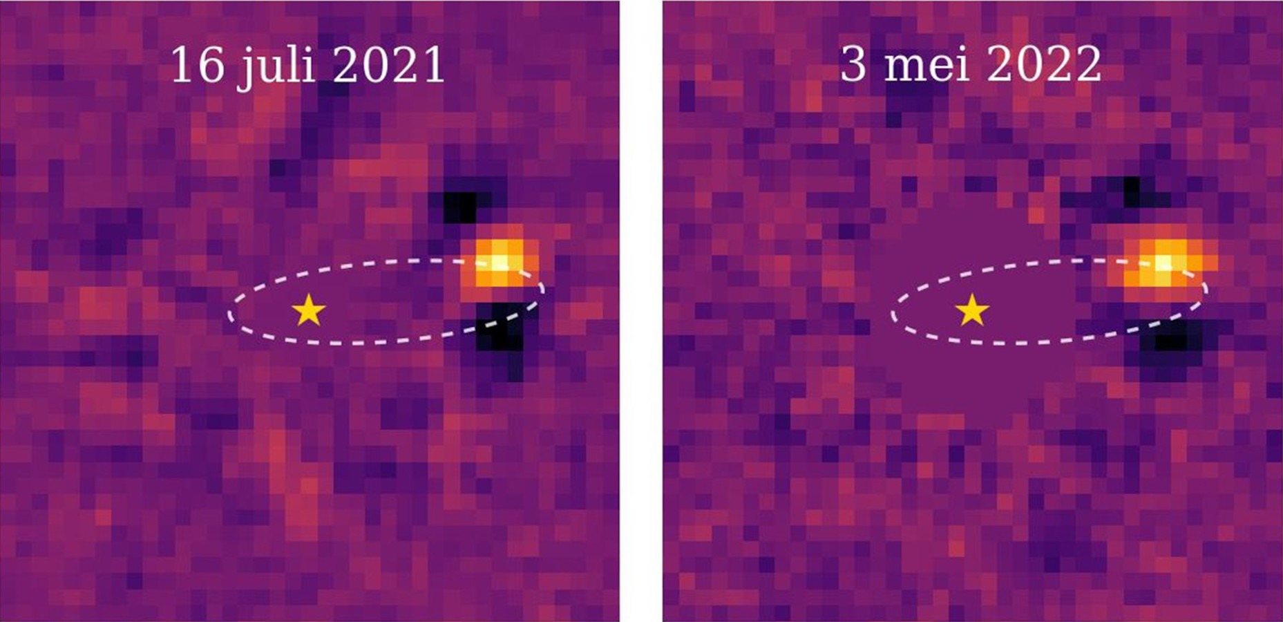 Een internationaal onderzoeksteam, onder leiding van Tomas Stolker (Universiteit Leiden) heeft een jonge gasvormige reuzenplaneet in beeld gebracht bij een slechts twaalf miljoen jaar oude ster. De planeet draait op ruime afstand rond een ster waar de planeetvorming klaar is, terwijl de even oude partnerster nog omgeven is door een planeet-vormende schijf (Astronomy & Astrophysics). Het dubbelstersysteem HD 135344 AB bevindt zich op ongeveer 440 lichtjaar afstand in het sterrenbeeld Wolf. Het bestaat uit twee jonge sterren – A en B – die op zeer grote afstand om elkaar draaien. Tomas Stolker bestudeerde ster B al tijdens zijn promotieonderzoek (2013-2017) vanwege diens interessante planeet-vormende schijf. ‘Maar ster A was nooit bestudeerd omdat die geen schijf had. Mijn collega’s en ik waren benieuwd of daar misschien al een planeet was gevormd’, zegt Stolker. ‘En het antwoord is nu dus – na vier jaar minutieus meten en wat geluk: ja.’ De nieuw ontdekte exoplaneet, HD 135344 Ab, is een jonge gasreus die hooguit twaalf miljoen jaar oud is. Hij heeft ongeveer tien keer zoveel massa als Jupiter en bevindt zich op een afstand tot zijn ster die vergelijkbaar is met de afstand van Uranus tot de zon. De onderzoekers wijzen erop dat de bijbehorende ster A al klaar is met planeetvorming terwijl ster B nog een protoplanetaire schijf bezit. Dit betekent dat de planeetvorming rond dubbelsterren zich langs verschillende tijdlijnen kan voltrekken. De onderzoekers hebben het SPHERE-instrument van de Very Large Telescope (VLT) gebruikt om naar het zwakke licht van de mogelijke planeet te speuren. De planeet werd vrij snel gevonden, maar het was lange tijd niet duidelijk of het echt om een planeet ging of om een ster op de achtergrond. Om deze mogelijkheid uit te sluiten, volgden de onderzoekers de planeet ook met het GRAVITY-instrument. Dit instrument combineert het licht van de vier grote telescopen van de VLT en kon daardoor heel precies de locatie van de planeet in kaart brengen. De onderzoekers keken in vier jaar tijd zeven keer naar de ster en de planeet en zagen dat die zich samen verplaatsen. Het ging dus daadwerkelijk om een planeet en niet om een achtergrondster. (EE) (Image credit: Stolker et al.)
