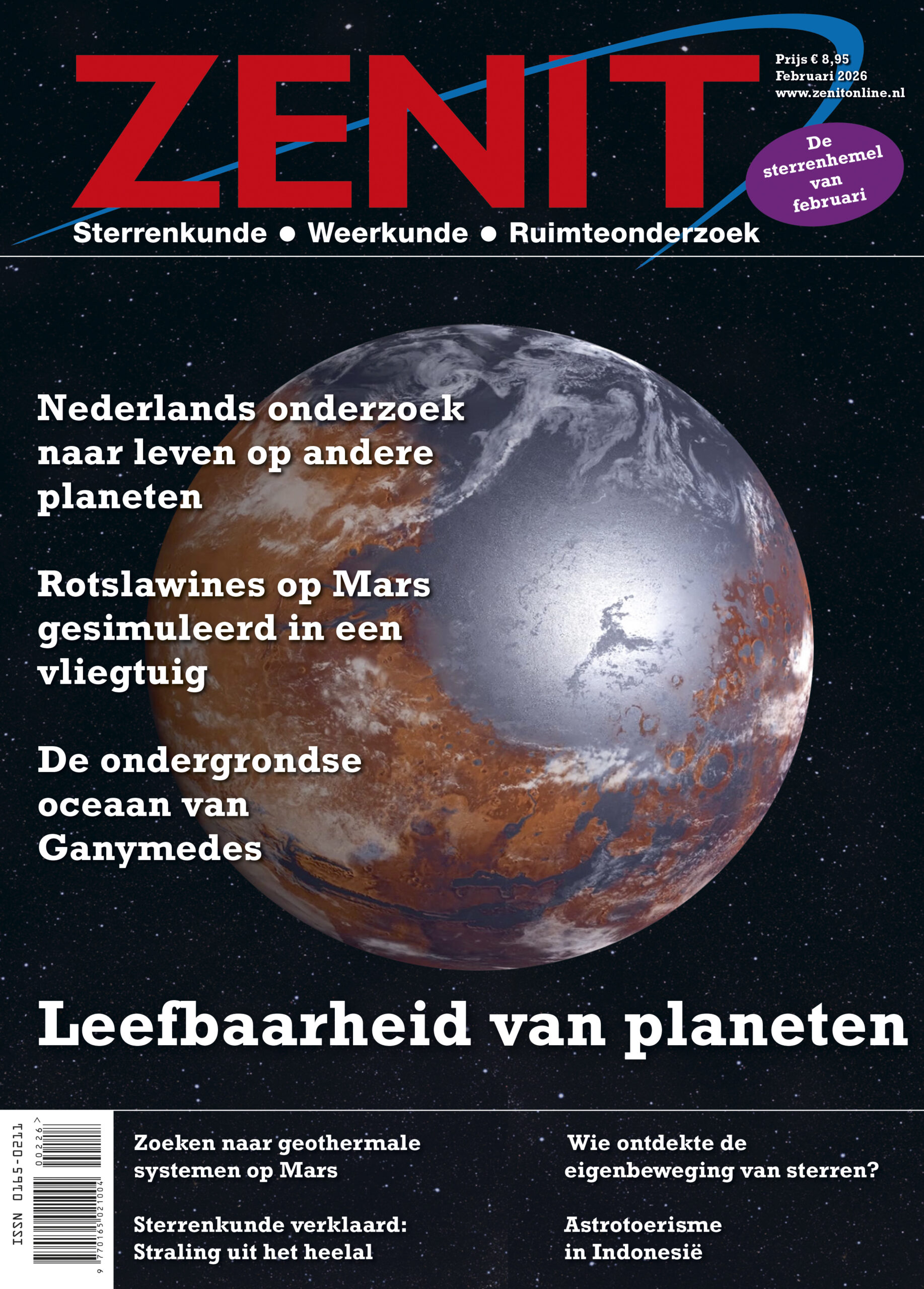 Wat maakt een planeet geschikt voor leven? Hoe kunnen we dit vanaf een afstand met telescopen en ruimtesondes waarnemen? Vragen die centraal staan in de zoektocht naar buitenaardsleven. Onderzoekers uit verschillende disciplines hebben in Nederland de krachten gebundeld in het Kennisnetwerk ‘Leefbaarheid van planeten’ om hierop antwoorden te geven. Reden voor Zenit om in samenwerking met het Kennisnetwerk een thema over dit onderwerp te presenteren. Wat komt daarin zoal aan bod? Om voor het leven belangrijke bouwstenen te vinden op een planeet als Mars, is kennis van geologische oppervlakteprocessen nodig. Dat wordt onderzocht met ondermeer paraboolvluchten in een vliegtuig. Het leven op aarde is wellicht ontstaan in geothermale systemen. Die komen ook op Mars voor als ‘moddervulkanen’ waarvan de afbeelding een mogelijk voorbeeld toont. Om soortgelijke systemen op Mars te kunnen herkennen, worden ze in IJsland van nabij bestudeerd. En de Jupitermaan Ganymedes herbergt waarschijnlijk een oceaan onder zijn ijskorst waarin misschien leefbare omstandigheden heersen. Met de Europese ruimtesonde JUICE, die de maan van nabij gaat bestuderen, wordt dat vanaf 2031 onderzocht. Genoeg leesvoer dus over de meest intrigerende vraag in de sterrenkunde.