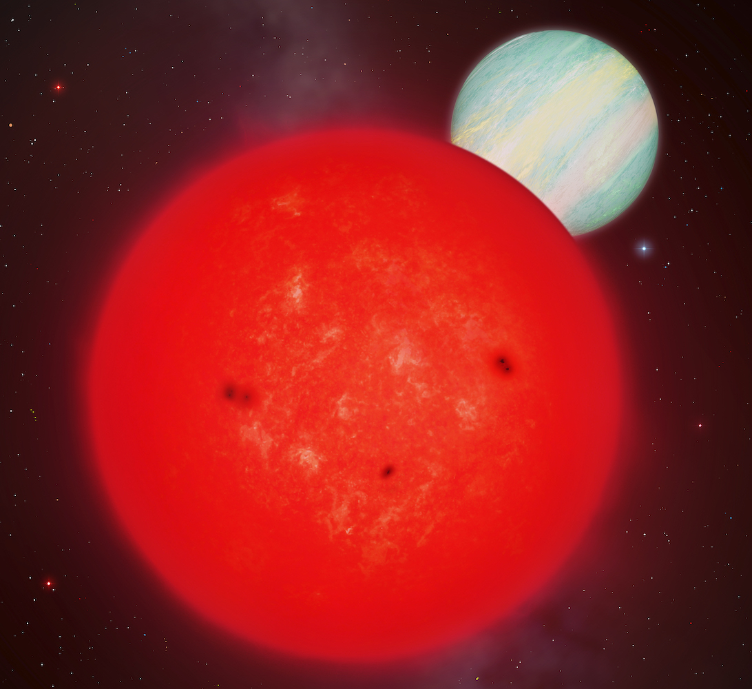 Ster TOI-6894 heeft vijf keer zo weinig massa als onze zon en is daarmee een van de vele rode dwergsterren in ons Melkwegstelsel. Naar verwachting zouden de omstandigheden rond deze kleine sterren niet geschikt zijn voor de vorming van grote planeten. Maar een internationaal team van astronomen heeft nu ontdekt dat rond TOI-6894 toch een reuzenplaneet cirkelt. De planeet, met de aanduiding TOI-6894b, is ontdekt in gegevens van NASA-satelliet TESS en zijn bestaan kon worden bevestigd met behulp van de Europese Very Large Telescope in Chili (Nature Astronomy). TOI-6894b is iets groter dan de planeet Saturnus in ons eigen zonnestelsel, maar heeft maar half zoveel massa. Zijn moederster TOI-6894 is (tot nu toe) de kleinste waarbij een planeet van deze omvang is ontdekt. De ontdekkers van TOI-6894b spreken van een ‘intrigerende ontdekking’. Ze begrijpen niet goed hoe zo’n kleine, lichte ster een planeet van deze omvang kan hebben gevormd. Volgens de meest gangbare theorie begint de vorming van een planeet met de geleidelijke opeenhoping van materiaal dat rond een ster is achtergebleven. Uiteindelijk ontstaat daarbij een vaste kern die gas uit zijn omgeving aantrekt en zo kan uitgroeien tot een gasreus. Theoretisch verloopt dit proces bij lichte sterren moeizaam, omdat er rond deze sterren maar weinig restmateriaal achterblijft dat voor de vorming van planeten kan worden gebruikt. De ontdekking van TOI-6894b wijst erop dat deze theorie niet helemaal kan kloppen. Blijkbaar kunnen planeten-in-wording ook rond rode dwergsterren genoeg gas verzamelen om tot reuzenplaneten uit te groeien, al is nog onduidelijk hóé. (EE) (Image credit: University of Warwick/Mark Garlick)