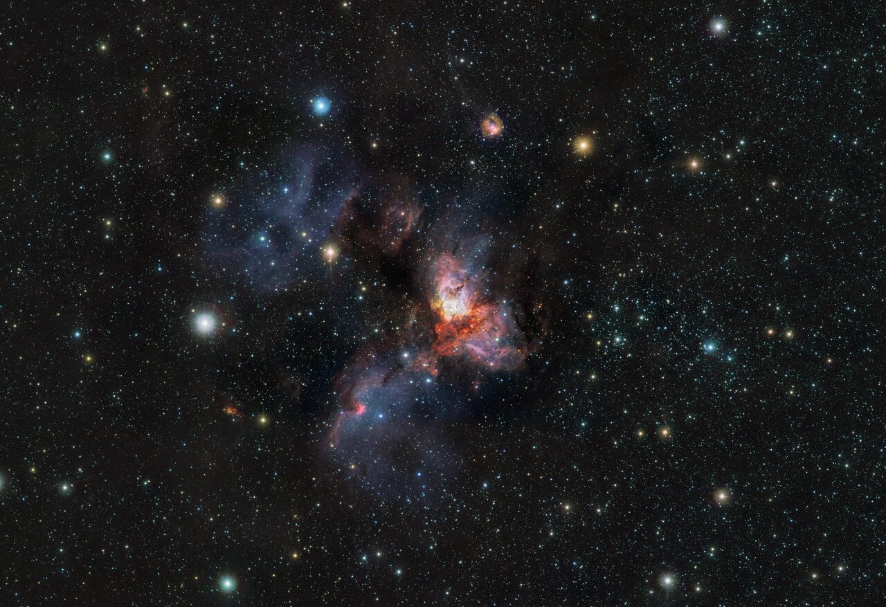 De Europese Zuidelijke Sterrenwacht (ESO) heeft een prachtige afbeelding van tachtig miljoen pixels vrijgegeven van de sterrenhoop RCW 38. De opname is gemaakt met ESO’s Visible and Infrared Survey Telescope for Astronomy (VISTA) in de Atacama-woestijn in Chili. Vergeleken met onze zon, die ongeveer 4,6 miljard jaar oud is en zich in een stabiele levensfase bevindt, zijn de sterren in RCW 38 nog erg jong. RCW 38 is minder dan een miljoen jaar oud en bevat zo’n tweeduizend sterren, die een psychedelisch ‘landschap’ hebben geschapen. De sterrenhoop bruist van de activiteit en is daarom een interessant doelwit voor astronomische waarnemingen. Sterrenhopen zijn een soort reusachtige snelkookpannen die alle ingrediënten voor het bereiden van sterren bevatten: dichte gaswolken en ondoorzichtige klonten kosmisch stof. Als dit mengsel van gas en stof onder invloed van zijn eigen zwaartekracht samentrekt, ontstaat er een nieuw ster. Door de intense straling van deze pasgeboren sterren gaat het gas dat de sterrenhoop omhult gloeien, waardoor de roze tinten ontstaan die op de nieuwe foto van RCW 38 te zien zijn. Het is werkelijk een spectaculair schouwspel, maar in zichtbaar licht blijven veel sterren in de sterrenhoop voor ons verborgen, omdat ze in stof zijn gehuld. De VISTA-telescoop van de ESO-sterrenwacht op Paranal neemt echter infrarood licht waar dat – in tegenstelling tot zichtbaar licht – bijna niet door stof wordt gehinderd. Zo wordt de ware kleurenpracht van RCW 38 zichtbaar. Plotseling zien we ook jonge sterren in stofrijke cocons, en koude ‘mislukte’ sterren die bruine dwergen worden genoemd. Nadat deze foto was gemaakt, is VISTA’s trouwe VIRCAM-camera, die vanaf 2008 een indrukwekkend aantal surveys heeft uitgevoerd, met pensioen gegaan. Later dit jaar krijgt de telescoop een gloednieuw instrument – 4MOST – dat voor een groot hemelgebied de spectra van 2400 objecten tegelijk vastlegt. (EE) (Image Credit: ESO/VVVX survey)