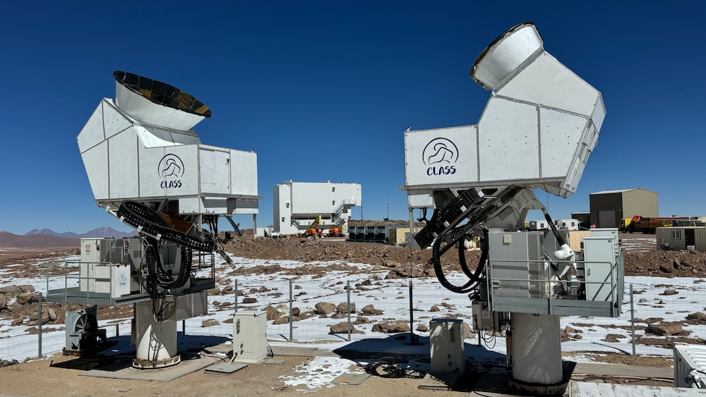 Voor het eerst hebben astronomen met telescopen op aarde dertien miljard jaar terug in de tijd gekeken, om te zien hoe de eerste sterren in het heelal het licht hebben beïnvloed dat vrijkwam bij de oerknal. Daarbij hebben ze gebruik gemaakt van telescopen hoog in het Andesgebergte in het noorden van Chili, waarmee kosmische microgolven kunnen worden gemeten. Zo zijn ze meer te weten gekomen over een van de minst begrepen tijdperken in de geschiedenis van het heelal: de zogeheten kosmische dageraad (Astrophysical Journal). Kosmische microgolven hebben golflengten van slechts enkele millimeters en zijn erg zwak. Het signaal van gepolariseerd microgolf-licht is zelfs nog ongeveer een miljoen keer zwakker. Op aarde wordt dit signaal vaak overstemd door radiozenders, radar en satellieten. Ook kunnen veranderingen in de atmosfeer, het weer en de luchttemperatuur het signaal vervormen. Zelfs onder perfecte omstandigheden is voor het meten van dit soort microgolf-licht extreem gevoelige apparatuur nodig. Wetenschappers van het CLASS-project – CLASS staat voor Cosmology Large Angular Scale Surveyor – hebben nu telescopen gebruikt die speciaal zijn ontworpen om de vingerafdrukken van de eerste sterren in het licht van de oerknal te detecteren – iets wat tot nu toe alleen mogelijk was met behulp van apparatuur in de ruimte, zoals NASA’s Wilkinson Microwave Anisotropy Probe (WMAP) en de Europese ruimtetelescoop Planck. Door de CLASS-gegevens te vergelijken met de gegevens van Planck en WMAP, hebben de astronomen het gezochte gepolariseerde microgolf-licht kunnen meten. Polarisatie treedt op wanneer lichtgolven ergens tegenaan botsen en vervolgens worden verstrooid. Na de oerknal was het heelal gevuld met een ‘mist’ van elektronen die zo dicht was, dat licht er niet doorheen kwam. Maar doordat het heelal uitdijde en afkoelde, werden deze elektronen ingevangen door protonen. Zo ontstonden neutrale waterstofatomen. Toen zich vervolgens tijdens de kosmische dageraad de eerste sterren vormden, rukte hun intense straling de elektronen weer los van de waterstofatomen. Het onderzoeksteam heeft nu de kans gemeten dat een foton van de oerknal onderweg op een van die vrijgemaakte elektronen stuitte en uit koers raakte. Met behulp van dit resultaat kunnen signalen van de restgloed van de oerknal, oftewel de kosmische achtergrondstraling, beter worden gekarakteriseerd en wordt een duidelijker beeld verkregen van het vroege heelal. (EE) (Image credit: Deniz Valle & Jullianna Couto)