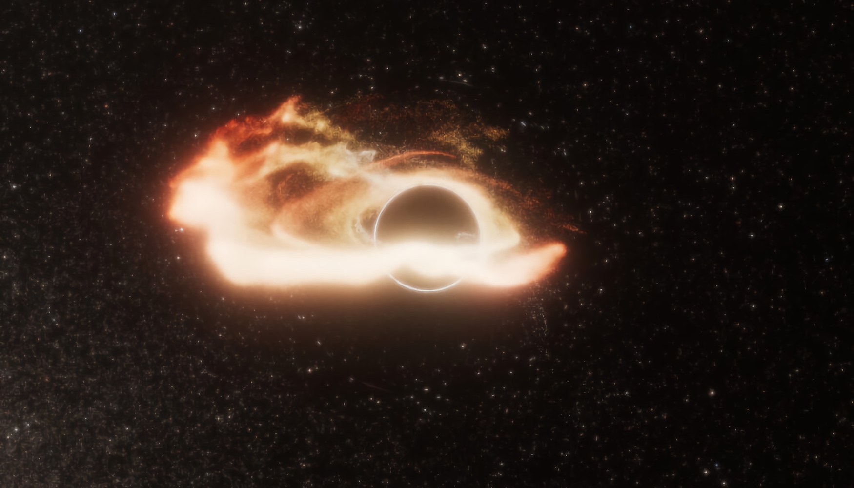 Astronomen hebben al bijna honderd voorbeelden ontdekt van enorme zwarte gaten die sterren aan flarden trekken en opslokken. In bijna alle gevallen bevinden deze zwarte gaten zich in de kernen van grote sterrenstelsels. Maar nu hebben onderzoekers van de Universiteit van Californië voor het eerst een massarijk zwart gat ontdekt dat een ster verscheurt die 2600 lichtjaar is verwijderd van de kern van een sterrenstelsel, dat zelf óók een zwaar zwart gat bevat. Het zwarte gat, met ongeveer een miljoen keer zoveel massa als onze zon, hield zich schuil in de buitenste regionen van de zogeheten bulge – de centrale uitstulping – van het sterrenstelsel. Het heeft zich verraden doordat het een ster aan flarden heeft getrokken – een proces dat tidal disruption event of kortweg TDE wordt genoemd. Bij een TDE trekt de immense zwaartekracht van een zwart gat aan een ster, vergelijkbaar met de manier waarop de maan de getijden op aarde veroorzaakt, maar dan vele malen heftiger. Ook het zware zwarte gat in de kern van het sterrenstelsel, dat ongeveer honderd miljoen keer zoveel massa heeft als onze zon, is bezig om zich vol te proppen, maar dan met gas dat te dicht in zijn buurt is gekomen om nog te kunnen ontsnappen. De ontdekking van twee enorme zwarte gaten in het centrum van een sterrenstelsel komt niet echt als een verrassing. Het lijkt er namelijk sterk op dat de meeste grote sterrenstelsels een zwaar zwart gat in hun kern hebben. En omdat sterrenstelsels vaak botsen en samensmelten, zouden sommige grote sterrenstelsels meer dan één zwart gat moeten herbergen. Deze zwarte gaten verraden hun aanwezigheid echter pas wanneer ze nabijgelegen sterren of gaswolken verorberen, waardoor een kortstondige uitbarsting van licht ontstaat. Astronomen hebben berekend dat een zwaar zwart gat gemiddeld eens in de dertigduizend jaar een ster tegenkomt. De nieuwe TDE, met de aanduiding AT2024tvd, werd ontdekt door de Zwicky Transient Facility, een optische camera op een telescoop van de Palomar-sterrenwacht bij San Diego (VS), en is bevestigd met waarnemingen door andere telescopen, waaronder de Hubble-ruimtetelescoop. (EE) (Image credit: NASA, ESA, STScI, Ralf Crawford (STScI)