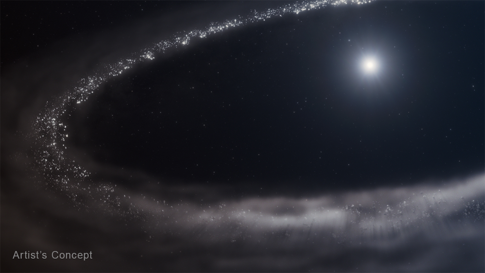 Is ook in planetenstelsels buiten het onze bevroren water te vinden? Astronomen vermoedden al heel lang van wel, deels omdat ze bij andere sterren al water in gasvorm – waterdamp dus – hadden gedetecteerd. Maar nu is er ook hard bewijs: wetenschappers hebben de aanwezigheid van kristallijn waterijs ontdekt in de puinschijf rond een zonachtige ster die 155 lichtjaar van ons is verwijderd. De ontdekking is gebaseerd op gegevens die zijn verzameld met de Webb-ruimtetelescoop (Nature). ‘Webb heeft niet alleen zonder twijfel waterijs gedetecteerd, maar ook kristallijn waterijs, zoals dat eveneens te vinden is in de ringen van Saturnus of in de ijsdwergen in het buitengebied van ons zonnestelsel,’ aldus Chen Xie, hoofdauteur van het Nature-artikel en assistent-onderzoeker aan de Johns Hopkins University in Baltimore, Maryland (VS). Al het bevroren water dat Webb heeft geregistreerd, is gebonden aan fijne stofdeeltjes in de puinschijf rond de ster. Astronomen wachtten al tientallen jaren op deze doorslaggevende gegevens. ‘Toen ik 25 jaar geleden afstudeerde, vertelde mijn begeleider me dat er ijs in puinschijven moest zitten, maar voordat Webb er was hadden we geen instrumenten die gevoelig genoeg waren om deze waarnemingen te doen’, zegt co-auteur Christine Chen, astronoom bij het Space Telescope Science Institute in Baltimore. ‘Het meest opvallende is dat deze gegevens lijken op andere recente Webb-waarnemingen van Kuipergordelobjecten in ons eigen zonnestelsel.’Waterijs is een belangrijk ingrediënt in de schijven rond jonge sterren. Het is van grote invloed op de vorming van reuzenplaneten en wordt door kleine hemellichamen zoals kometen en planetoïden ook aan al volgroeide rotsachtige planeten geleverd. Nu waterijs bij een andere ster is gedetecteerd, kunnen astronomen gaan onderzoeken welke processen zich in andere planetenstelsels dan het onze afspelen. De onderzochte ster, die te boek staat als HD 181327, is aanzienlijk jonger dan onze zon. Zijn leeftijd wordt geschat op slechts 23 miljoen jaar. Ter vergelijking: onze zon is 4,6 miljard jaar oud. De ster is ook iets zwaarder en heter dan de zon. De Webb-waarnemingen laten zien dat er een aanzienlijke leemte zit tussen de ster en zijn puinschijf. Verder naar buiten lijkt deze schijf op de Kuipergordel van ons zonnestelsel, waar zich dwergplaneten, kometen en andere brokken ijs en gesteente bevinden. Miljarden jaren geleden heeft onze Kuipergordel er waarschijnlijk ongeveer net zo uitgezien als de puinschijf rond HD 181327. Het waterijs is niet gelijkmatig verdeeld over de puinschijf: het meeste bevindt zich in het koudste deel van de schijf, dat het verst van de ster verwijderd is. Verder naar binnen troffen de onderzoekers minder waterijs aan. Het lijkt erop dat zich in het hart van de puinschijf iets sneller bevroren waterdeeltjes vormen dan dat er door onderlinge botsingen verdampen. In de directe omgeving van de ster heeft Webb bijna geen ijsdeeltjes gedetecteerd. Waarschijnlijk zijn de ijzige deeltjes daar verdampt onder invloed van het ultraviolette licht van de centrale ster. (EE) (Image credit: NASA, ESA, CSA, STScI, Ralf Crawford (STScI)