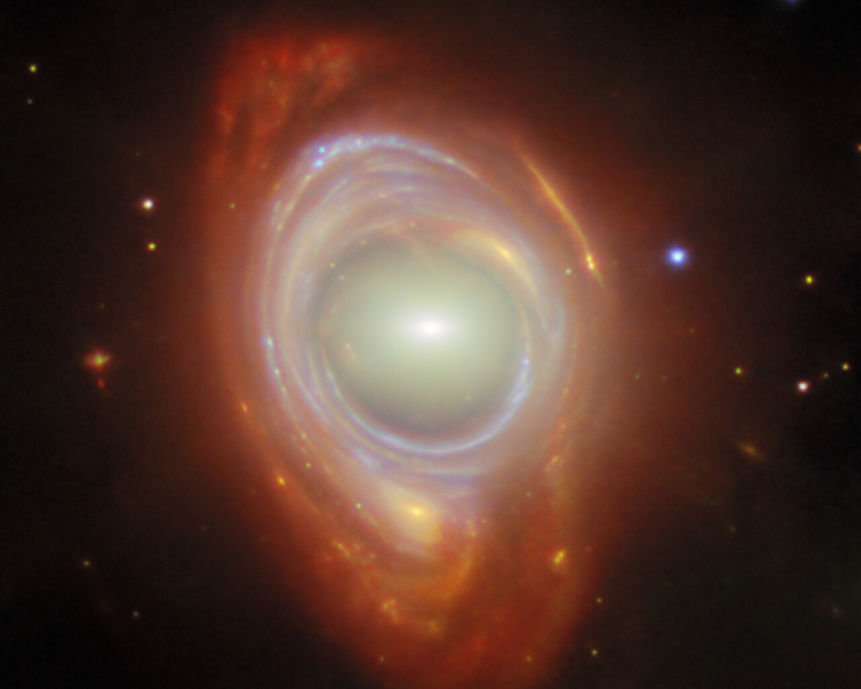 Op een recent gepresenteerde opname van de Webb-ruimtetelescoop is een schoolvoorbeeld te zien van een zogeheten Einsteinring. Wat op het eerste gezicht één enkel, vreemd gevormd sterrenstelsel lijkt te zijn, is in werkelijkheid een tweetal sterrenstelsels op zeer verschillende afstanden. Het nabijere voorgrondstelsel staat in het centrum van de foto. Zijn zwaartekracht heeft het verder weg staande stelsel vervormd tot een ring. Een Einsteinring ontstaat wanneer licht van een verafgelegen object wordt afgebogen (of ‘gelensd’) door een zwaar tussenliggend object dat als lens fungeert. Voorwaarde is wel dat de twee objecten vanaf de aarde gezien op één lijn staan. De afbuiging ontstaat doordat massa de vierdimensionale structuur van ons heelal – de zogeheten ruimtetijd – vervormt. Dit effect is heel subtiel – té subtiel om op lokaal niveau waarneembaar te zijn. Dat wordt anders als we te maken hebben met afbuiging van licht op astronomische schaal, zoals wanneer het licht van een sterrenstelsel wordt afgebogen rond een ander sterrenstelsel of een cluster van sterrenstelsels. Einsteinringen zijn een ideaal hulpmiddel om sterrenstelsels te onderzoeken die eigenlijk te zwak en te ver weg zijn om ze rechtstreeks te kunnen waarnemen. Het object in het centrum van de Einsteinring die door Webb is vastgelegd, is een elliptisch sterrenstelsel dat deel uitmaakt van een cluster van sterrenstelsels met de aanduiding SMACSJ0028.2-7537. Het tot een ring vervormde gelensde sterrenstelsel daaromheen is een spiraalstelsel. Ondanks de sterke vervorming zijn in dit verre sterrenstelsel duidelijk afzonderlijke structuren herkenbaar, waaronder een aantal sterrenhopen. De opname is gemaakt in het kader van een internationale survey, onder leiding van Guillaume Mahler van de Universiteit van Luik (België). Het doel van deze survey, ’SLICE’ geheten, is om 182 clusters van sterrenstelsels te onderzoeken met de nabij-infraroodcamera van de Webb-ruimtetelescoop. (EE) (Image credit: ESA/Webb, NASA & CSA, G. Mahler)