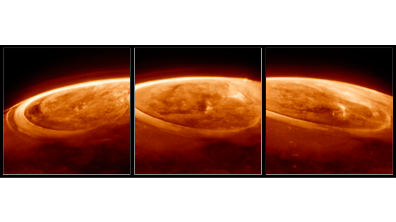 NASA’s Webb-ruimtetelescoop heeft nieuwe details vastgelegd in het poollicht op de grootste planeet van ons zonnestelsel. De waargenomen poollichten op Jupiter zijn honderden keren helderder dan die op aarde en vertonen verrassend snelle variaties (Nature Communications, 12 maart). Poollichten – ook wel aurora’s genoemd – ontstaan wanneer energierijke deeltjes de atmosfeer van een planeet in de buurt van de magnetische polen binnendringen en in botsing komen met atomen of gasmoleculen. De aurora’s op Jupiter zijn niet alleen enorm groot, ze zijn ook honderden keren energierijker dan de aurora’s in de atmosfeer van de aarde. Het poollicht op onze planeet wordt veroorzaakt door geladen deeltjes van onze zon die de hoge atmosfeer binnendringen, de daar aanwezige gassen van energie voorzien en ze in rode, groene en paarse tinten laten gloeien. Jupiter heeft nog een andere bron van poollicht: zijn sterke magnetische veld vangt geladen deeltjes uit de omgeving op – niet alleen deeltjes van de zon, maar ook deeltjes die de ruimte in worden geslingerd door Jupitermaan Io, die bekendstaat om zijn talrijke vulkanen. De vulkanen van Io stoten deeltjes uit die aan de zwaartekracht van deze maan ontsnappen en om Jupiter blijven cirkelen. Ook geladen deeltjes die door de zon zijn uitgezonden bereiken Jupiter. Het omvangrijke, sterke magnetische veld van de planeet vangt ze op en versnelt ze tot enorme snelheden. Deze energierijke deeltjes dringen de atmosfeer van de planeet binnen, en brengen de daarin aanwezige gassen aan het gloeien. De nieuwe Webb-opnamen geven meer inzicht in het poollicht op Jupiter. Dankzij de grote gevoeligheid van de ruimtetelescoop heeft een team van astronomen, onder leiding van Jonathan Nichols van de Universiteit van Leicester (VK), snel veranderende verschijnselen in het poollicht van de planeet kunnen vastleggen. ‘We wilden zien hoe snel de aurora’s veranderden, in de verwachting dat ze maar heel geleidelijk zouden oplichten en uitdoven, misschien in een kwartier of zo. Maar in plaats daarvan varieerden de poollichten van de planeet op tijdschalen van seconden,’ aldus Nichols. ‘Wat deze waarnemingen nog bijzonderder maakte, is dat we tegelijkertijd ook ultraviolet-foto’s konden maken met de Hubble-ruimtetelescoop. Maar opmerkelijk genoeg kende het helderste licht dat Webb waarnam geen echte tegenhanger in de Hubble-foto’s. Dit heeft ons op het verkeerde been gezet. Om de helderheid te veroorzaken zoals die door zowel Webb als Hubble is waargenomen, moeten grote hoeveelheden zeer laag-energetische deeltjes de atmosfeer binnendringen. We begrijpen nog steeds niet hoe dit kan.’Het team is nu van plan om deze discrepantie tussen de Hubble- en Webb-data nader te bestuderen en meer waarnemingen met Webb te gaan doen, om deze te kunnen vergelijken met gegevens van NASA-ruimtesonce Juno, die momenteel om Jupiter cirkelt, om zo de oorzaak van de raadselachtige heldere lichtemissies te kunnen vinden. (EE) (Image credit: NASA, ESA, CSA, Jonathan Nichols (University of Leicester), Mahdi Zamani (ESA/Webb)