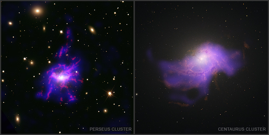 Astronomen hebben vastgesteld dat de zwaarste zwarte gaten in het heelal hun eigen kostje kunnen koken. Gegevens van NASA’s röntgen-ruimtetelescoop Chandra en de Europese Very Large Telescope (VLT) hebben nieuw bewijs geleverd dat uitbarstingen van zwarte gaten gas kunnen helpen afkoelen, zodat ze zichzelf daarmee kunnen voeden. De nieuwe bevinding is gebaseerd op waarnemingen van zeven clusters van sterrenstelsels (Nature Astronomy). In de centra van clusters van sterrenstelsels bevinden zich de allerzwaarste sterrenstelsels van het heelal. Deze kosmische samenscholingen herbergen enorme zwarte gaten met massa’s die uiteenlopen van miljoenen tot tientallen miljarden zonsmassa’s. De jets van deze zwarte gaten worden aangedreven door zwarte gaten die zich tegoed doen aan gas. De nieuwe onderzoeksresultaten ondersteunen een model waarbij de uitbarstingen van zwarte gaten heet gas doen afkoelen en slanke filamenten van koeler gas vormen. Daarbij spelen ook turbulenties in het gas een belangrijke rol. Volgens het model zou een deel van het warme gas in deze filamenten vervolgens naar de centra van de sterrenstelsels moeten stromen om de zwarte gaten te voeden, wat een uitbarsting veroorzaakt. De uitbarsting zorgt ervoor dat meer gas afkoelt en de zwarte gaten voedt, wat vervolgens weer tot volgende uitbarstingen leidt. Het model voorspelt verder dat er een verband bestaat tussen de helderheid van filamenten van warm en heet gas in de centra van clusters van melkwegstelsels. Concreet betekent dit dat in gebieden waar het hete gas helderder is, het warme gas ook helderder zou moeten zijn. Het team van astronomen heeft dit verband nu voor het eerst ook echt waargenomen. Het nieuwe resultaat geeft meer inzicht in de rol die de gasrijke filamenten spelen. Deze blijken niet alleen van belang te zijn voor het ‘voeden’ van de zwarte gaten, maar ook voor de vorming van nieuwe sterren. (EE) (Image credit: X-ray: NASA/CXC/SAO/V. Olivares et al.; Optical/IR: DSS; H-alpha: CFHT/SITELLE; Image Processing: NASA/CXC/SAO/N. Wolk)